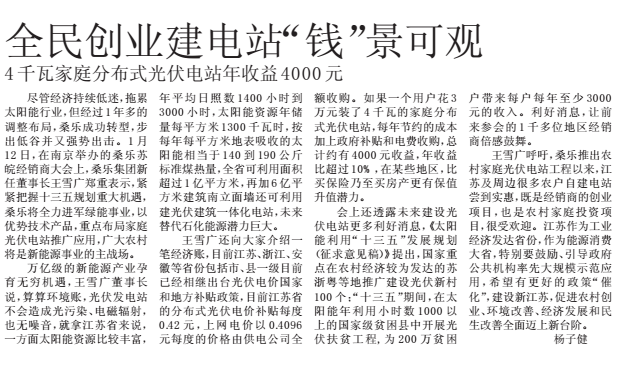王雪廣還向大家介紹一筆經(jīng)濟(jì)賬,目前江蘇、浙江、安徽等省份包括市、縣一級目前已經(jīng)相繼出臺光伏電價(jià)國家和地方補(bǔ)貼政策,目前江蘇省的分布式光伏電價(jià)補(bǔ)貼每度0.42元,上網(wǎng)電價(jià)以0.4096元每度的價(jià)格由供電公司全額收購。如果一個用戶花3萬元裝了4千瓦的家庭分布式光伏電站,每年節(jié)約的成本加上政府補(bǔ)貼和電費(fèi)收購,總計(jì)約有4000元收益,年收益比超過10%,在某些地區(qū),比買保險(xiǎn)乃至買房產(chǎn)更有保值升值潛力。